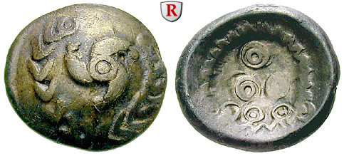 Rainbowcup 20 mm 1. cent.BC. Triskelis within wreath / Six annulets, three with pellet within them and three with an annulet; around, zigzag border. Dembski 469; good very fine