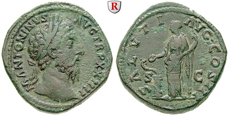 Zur Münzgeschichte: Seine reiche Prägung, hauptsächlich aus den Münzstätten Rom und Lyon, wird vor allem durch den Denar, der etwa 40 Jahre lang sein Portrait abbildet, bestimmt. Es gibt Münzen, die den gelockten Jüngling, später den bärtigen Mann und schließlich den alten Kaiser mit Vollbart darstellen.