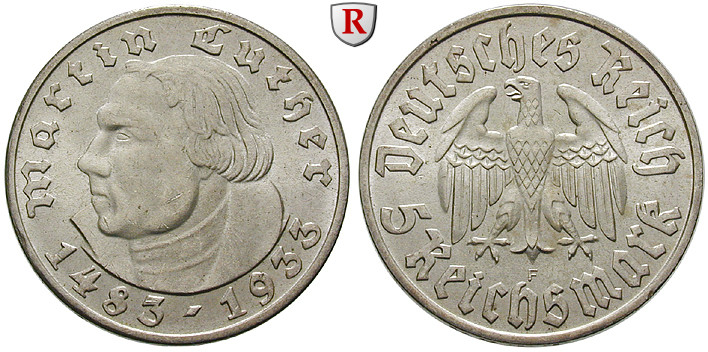 5 Reichsmark 1933 F. Luther. J. 353; vorzüglich-stempelfrisch / stempelfrisch