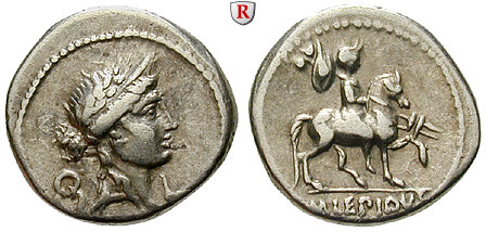 M. Aemilius Lepidus 61 v.Chr. Denar 18 mm 61 v.Chr. Rom. Weiblicher Kopf r. mit Stephane und Lorbeerkranz, dahinter Kranz, davor Simpulum / M LEPIDVS Reiterstatue des Marcus Aemilius Lepidus r. mit Trophäe. Cr. 419/1d; sehr schön +