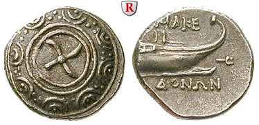 Autonome Prägung z. Z. Philipp V. u. Perseus 221-168 v.Chr. Tetrobol 15 mm 185-168 v.Chr. Makedonischer Schild, im Mittelmedaillon Wirbel / Prora r. SNG Cop. 1289vgl.; sehr schön - vorzüglich