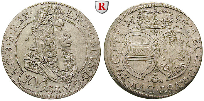 Leopold I. 1657-1705. 15 Kreuzer 1694 Hall. Herinek 985; sehr schön - vorzüglich