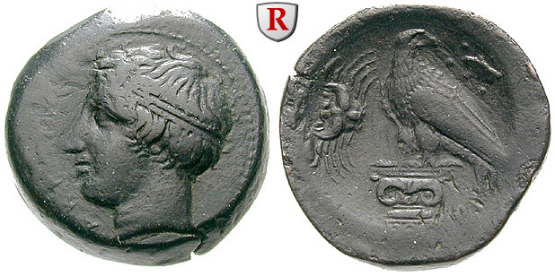 AE-Hemilitron 25 mm 400-380 v.Chr. Kopf des jugendlichen Flussgottes Akragas l., Horn an der Stirn, Band im Haar / Adler mit geschlossenen Flügeln auf einem ionischen Kapitell l.; Krabbe im l. Feld: sechs Wertkugeln in Doppelreihe im r. Feld. CNS 89; sehr schön - vorzüglich