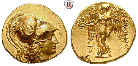 Alexander III. der Grosse 336-323 v.Chr. Stater 19 mm 325-320 v.Chr. Citium (Zypern). Kopf der Athena r. mit korinthischem Helm / Nike r. hält Kranz und Stylis, Beizeichen Monogramm. Price 3100; GOLD, sehr schön-vorzüglich / vorzüglich +, Schürfspur auf Vs., Schrf. auf Rs.