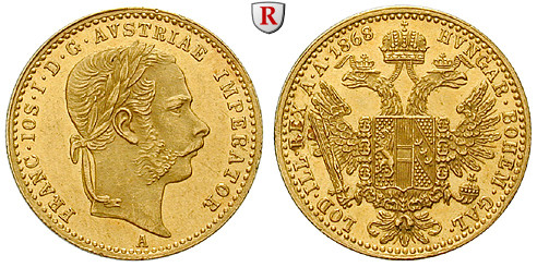 Franz Joseph I. 1848-1916. Dukat 3,44 g fein, 1868 A. Älterer Kopf rechts mit Lorbeerkranz und längerem Backenbart / Gekrönter Doppeladler. Friedb. 492; GOLD, fast vorzüglich