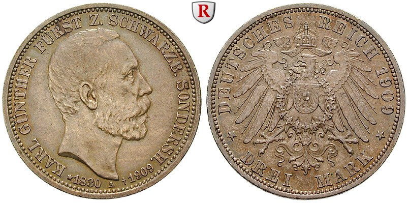 Karl Günther 1880-1909. 3 Mark 1909 A. auf den Tod. J. 170; vorzüglich