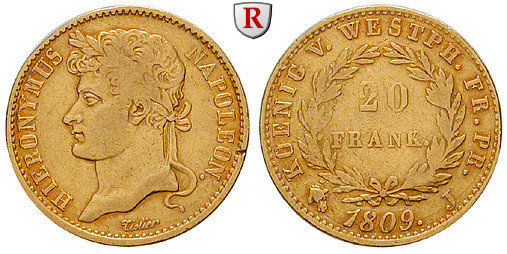 Hieronymus Napoleon 1807-1813. 20 Franken 1809 J - Kassel / Paris. Mzz. Pferdekopf. Kopf l. mit Lorbeerkranz / Wert im Kranz. Friedb. 3517; GOLD, sehr schön, Rdf.