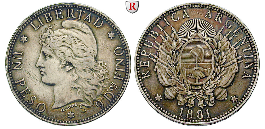 Republik seit 1880. Peso 1881. Wappen / Freiheitskopf. KM 29; sehr schön, berieben; Kratzer und Rdf.