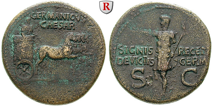 Zur Mnzgeschichte: Alle Mnzen für Germanicus wurden nach dessen Tode geprägt. Unter der Herrschaft seines Sohnes Caligula erschienen die meisten Prägungen zu Ehren des Feldherrn.