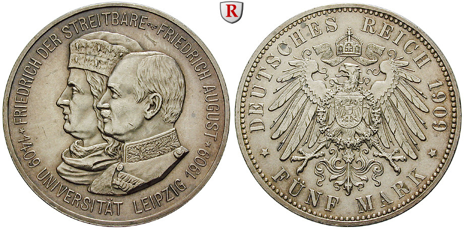 Friedrich August III. 1904-1918. 5 Mark 1909. Universität Leipzig. J. 139; fast vorzüglich / vorzüglich-stempelfrisch, Kratzer auf Vs.