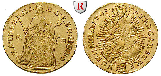 Maria Theresia 1740-1780. Ducat 1745 Kremnitz. Empress standing, wearing royal insignia / Madonna seated in flames. Friedb. 180; GOLD, nearly extremely fine, traces of filing at edge; waved