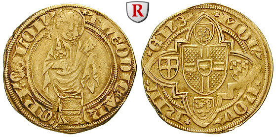 Dietrich II. von Mörs 1414-1463. Goldgulden o.J. (1420) Bonn. Stehender Petrus, zu Füßen Schild von Mörs / Im Dreipaß Schild Köln/Mörs, in den Winkeln Schilde von Mainz, Trier und Bayern. Friedb. 794; GOLD, sehr schön