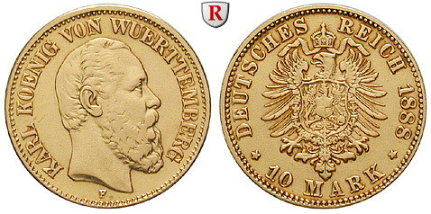 Karl 1864-1891. 10 Mark 1888 F. J. 292; GOLD, sehr schön, geputzt