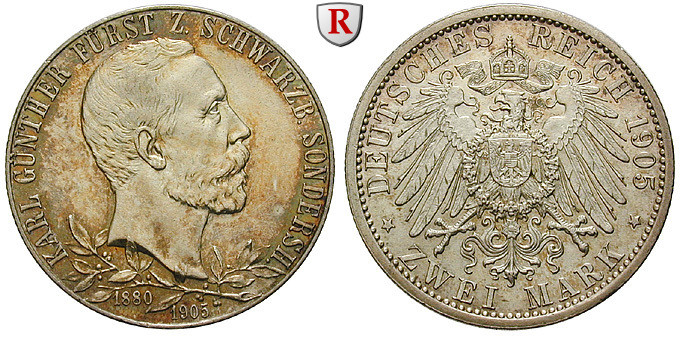 Karl Günther 1880-1909. 2 Mark 1905. Regierungsjubiläum, schmaler Randstab. J. 169a; fast vorzüglich / stempelfrisch