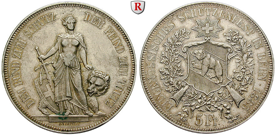 5 Franken 1885. Schützenfest in Bern. HMZ 2-1343o; sehr schön - vorzüglich, geputzt; kl. Rdf.
