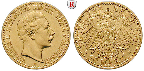 Wilhelm II. 1888-1918. 10 Mark 1901 A. J. 251; GOLD, good very fine