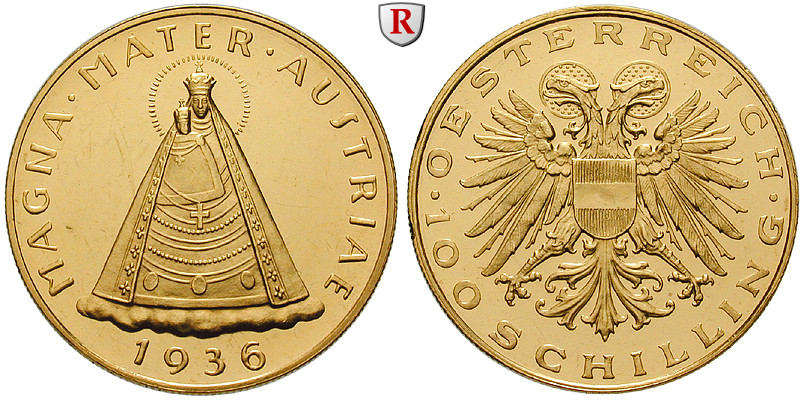 1. Republik 1918-1938. 100 Schilling 21,17 g fein, 1936. Madonna von Mariazell. Friedb. 522; GOLD, Polierte Platte, Haarlinien auf Vs.