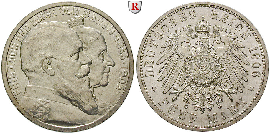 Friedrich I. 1852-1907. 5 Mark 1906 G. Goldene Hochzeit. J. 35; vorzüglich
