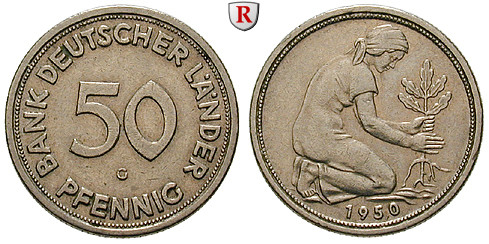 Kupfer-Nickel-50 Pfennig 1950 G. Bank Deutscher Länder. J. 379; sehr schön +