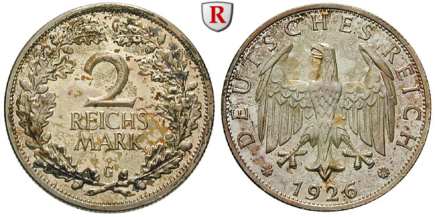 2 Reichsmark 1926 G. Kursmünze. J. 320; Polierte Platte, berührt