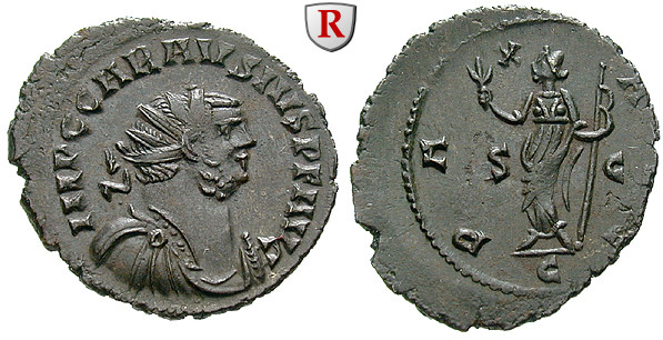 Carausius 287-293. AE-Antoninian 26 mm 291-292 Camulodunum. Drapierte und gepanzerte Büste r. mit Strahlenkrone IMP C CARAVSIVS PF AVG / PAX AVG Pax l., hält Zweig und Zepter, Mzz. C. RIC 300; vorzüglich, Rs. dezentriert