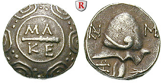 Autonome Prägung z. Z. Philipp V. u. Perseus 221-168 v.Chr. Tetrobol 13 mm 184-179 v.Chr. Pella oder Amphipolis. Makedonischer Schild, darauf Keule MA-KE / Makedonischer Helm, im Feld Monogramme und Dreizack. SNG Cop. 1282var.; sehr schön - vorzüglich