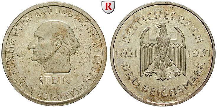 3 Reichsmark 1931 A. vom Stein. J. 348; Polierte Platte, l. berieben