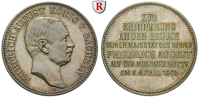 Friedrich August III. 1904-1918. Gedenkmünze in 2 Mark-Größe 1905. Münzbesuch. J. 137; vorzüglich-stempelfrisch, kl. Kratzer auf Vs.