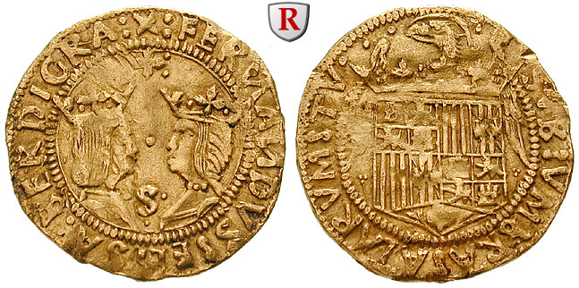 Ferdinand V. und Isabella 1474-1504. Doppelter Excelente 26 mm o.J. Sevilla. Die gekrönten Brustbilder einander gegenüber, dazwischen Punkt und S, darüber Kreuz flankiert von Punkten / Adler mit ausgebreiteten Flügeln, davor gekröntes Wappen. Friedb. 129; GOLD, sehr schön +, Schürfspuren am Rand