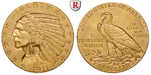 5 Dollars 7.52 g fine, 1911 Philadelphia. Indian head. Friedb. 148; GOLD, nearly extremely fine, edge knocks on rev.