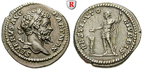 Septimius Severus 193-211. Denarius 19 mm 207 Rome. Laureate head right SEVERVS AVG PART MAX / RESTITVTOR VRBIS Emperor standing left with spear and patera, at his feet altar. RIC 167a; extremely fine