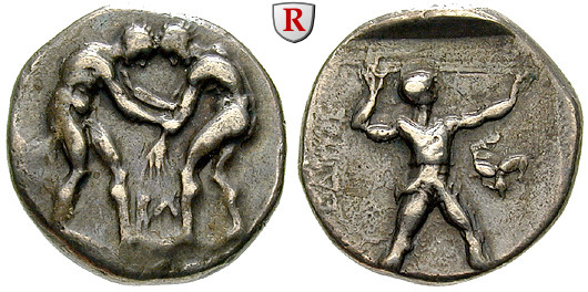 Stater 22 mm 380-325 v.Chr. Zwei nackte Ringer bei Kampfbeginn einander gegenüber stehend, zw. ihnen BL / Sphendonetes (Schleuderer) in Bereitschaft r., davor Triskeles. SNG France -; sehr schön +