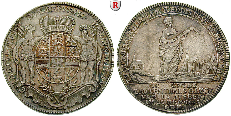 Karl 1735-1780. Reichstaler 40 mm 1752 Zellerfeld IBH. Ausbeute der Grube Lautenthals Glück. Dav. 2162; fast vorzüglich
