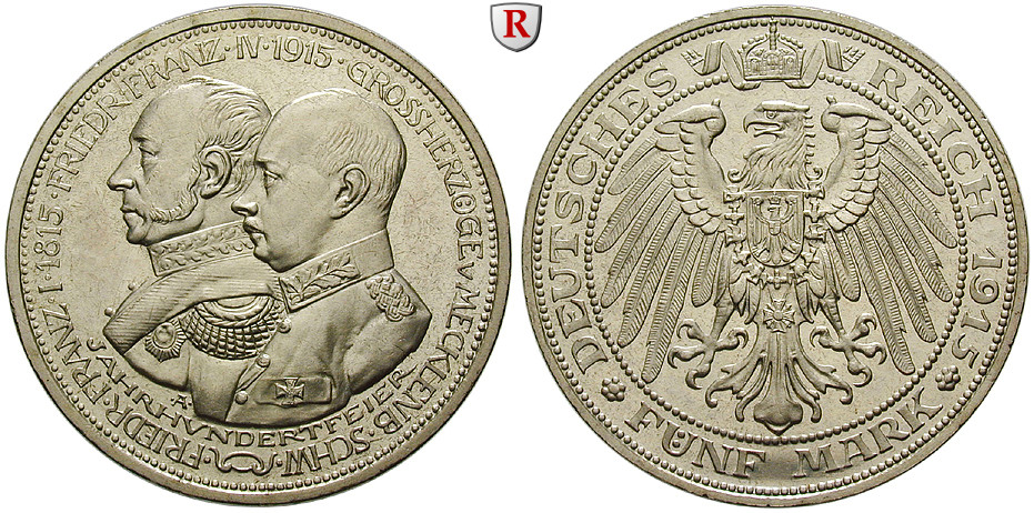 Friedrich Franz IV. 1897-1918. 5 Mark 1915 A. Jahrhundertfeier. J. 89; Polierte Platte, kl. Kratzer auf Vs.