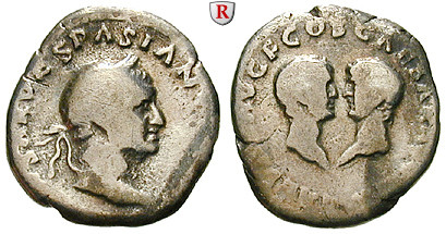 Zur Münzgeschichte: Vespasian gründete die neue Dynastie der Flavier und bestimmte direkt nach der Machtübernahme seine beiden Söhne Titus und Domitianus zu Nachfolgern als Caesaren. Auch durch seine Münzprägung versucht der Herrscher, diese Dynastie zu legitimieren. Von Anfang an prägten seine Söhne Titus und Domitianus Münzen mit ihren Portraits. Seltene Ausgaben besonders aus den ersten Regierungsjahren zeigen sogar alle drei Herrscher auf einer Münze.