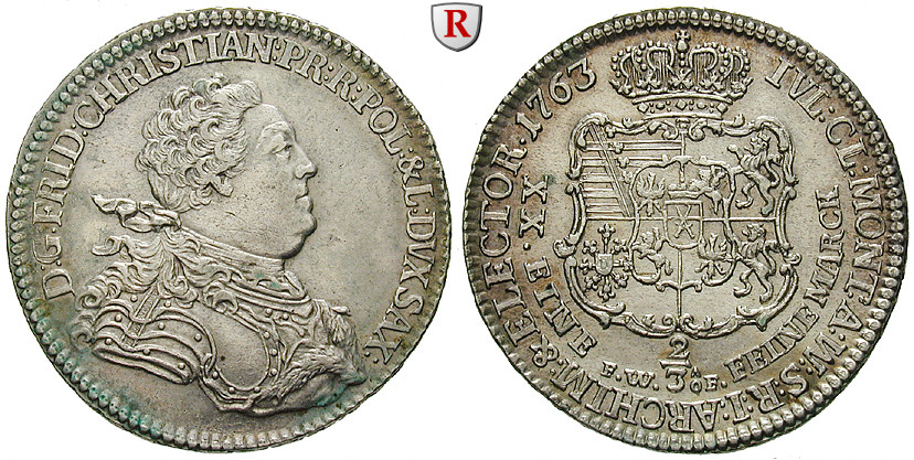 Friedrich Christian 1763. 2/3 Taler 1763 Dresden, FWoF. Merseb. 1889; sehr schön - vorzüglich