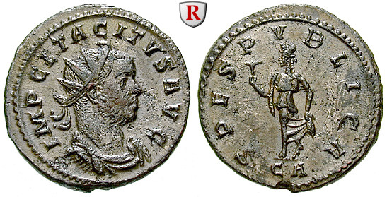 Zur Münzgeschichte: Die wichtigste Münze unter Tacitus war der Antoninian. Beim Prägen dieser Münze wurden die Vorgaben der Münzreform Aurelians beibehalten. Das Durchschnittsgewicht der Antoniniane betrug 3,8g bei einem Feingehalt von 4,5% Silber. Unzirkulierte Antoniniane des Tacitus sehen wie Silbermünzen aus, da durch die Technik des Weißsiedens das wenige Silber an die Oberfläche der Münze gebracht wurde. Münzen des Herrschers sind relativ selten.