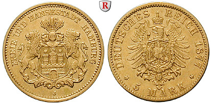 5 Mark 1877 J. J. 208; GOLD, sehr schön + / sehr schön-vorzüglich