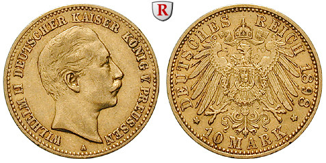 Wilhelm II. 1888-1918. 10 Mark 1898 A. J. 251; GOLD, very fine