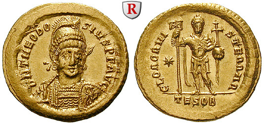 Theodosius II. 402-450. Solidus 22 mm 424-425 Thessalonika. Gepanzerte Büste von vorn mit Schild und Speer DN THEODOSIVS PF AVG / GLOR ORVIS TERRAR Herrscher von vorn, hält Labarum und Kreuzglobus, Stern im l. Feld. RIC 363; GOLD, vorzüglich +, Stempelfehler auf Wange