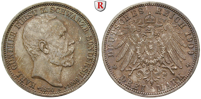 Karl Günther 1880-1909. 3 Mark 1909 A. J. 170; very fine to extremely fine / extremely fine
