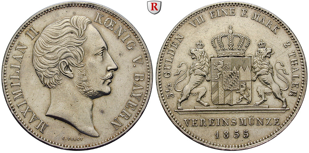 Maximilian II. 1848-1864. Vereinsdoppeltaler 1855. AKS 146; sehr schön - vorzüglich, kl. Rdf.; berieben