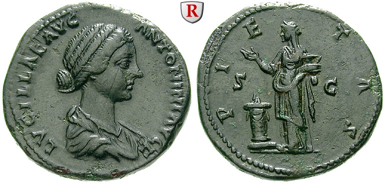 Lucilla, Frau des Lucius Verus 147-183. Messing-Sesterz 32 mm nach 164 Rom. Drapierte Büste r. LVCILLAE AVG ANTONINI AVG F / PIETAS SC Pietas l., hält Weihrauchkästchen und opfert über Altar. RIC 1756; fast vorzüglich, feiner Kratzer auf Vs., Felder geglättet