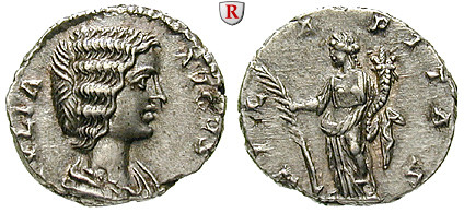 Zur Münzgeschichte:Ihre reichhaltige Münzprägung erfolgte unter ihrem Gatten, später unter ihrem Sohn und schließlich posthum und belegt ihre große religiös-politische Bedeutung. Sie erscheint auf den Münzen als Verkörperung von Pietas (Frömmigkeit), Pudicitia (Keuschheit), Concordia (Eintracht), Pax (Frieden) u.a. . Die alte karthagische Göttin Tinnit (Tanit) wird ihr als Virgo (Dea) Caelestis (Himmelgöttin) zugeordnet, um immer wieder das Kaiserhaus der Severer als göttlich darzustellen.