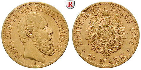 Karl 1864-1891. 10 Mark 1876 F. J. 292; GOLD, sehr schön, Hieb am Rand der Rs.