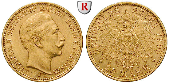 Wilhelm II. 1888-1918. 20 Mark 1905 J. J. 252; GOLD, sehr schön-vorzüglich / vorzüglich