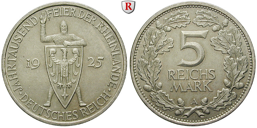 5 Reichsmark 1925 A. J. 322; extremely fine, minor scratches and edge marks