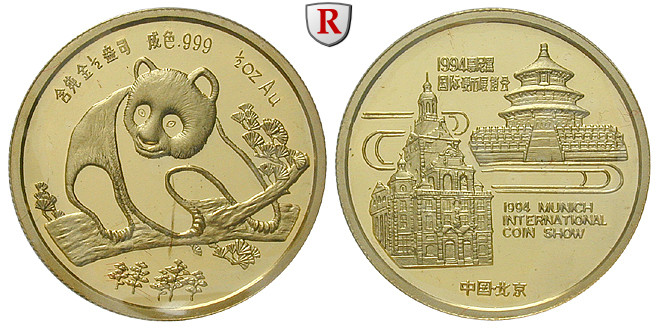 Volksrepublik seit 1949. 1/2 Unze 15,55 g fein, 1994. Internationale Münzmesse in München - Panda. KM X MB 78; GOLD, Polierte Platte, mit Zertifikat und Etui; in Originalfolie