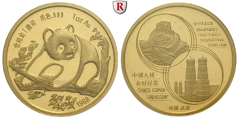 Volksrepublik seit 1949. 1 Unze 31,08 g fein, 1988. Internationale Münzmesse in München - Panda. KM X MB 25; GOLD, Polierte Platte, mit Originaletui; in Originalfolie
