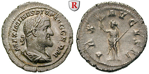 Zur Münzgeschichte: Seine Münzen stammen aus Rom, wohl auch aus Sirmium und Lugdunum (Lyon). Vorwiegend handelte es sich um Denare und Sesterzen. Die frühen Prägungen zeigen sein Portrait mit einem außerordentlich weit vorspringenden Kinn, das treffend seine Brutalität kennzeichnet.